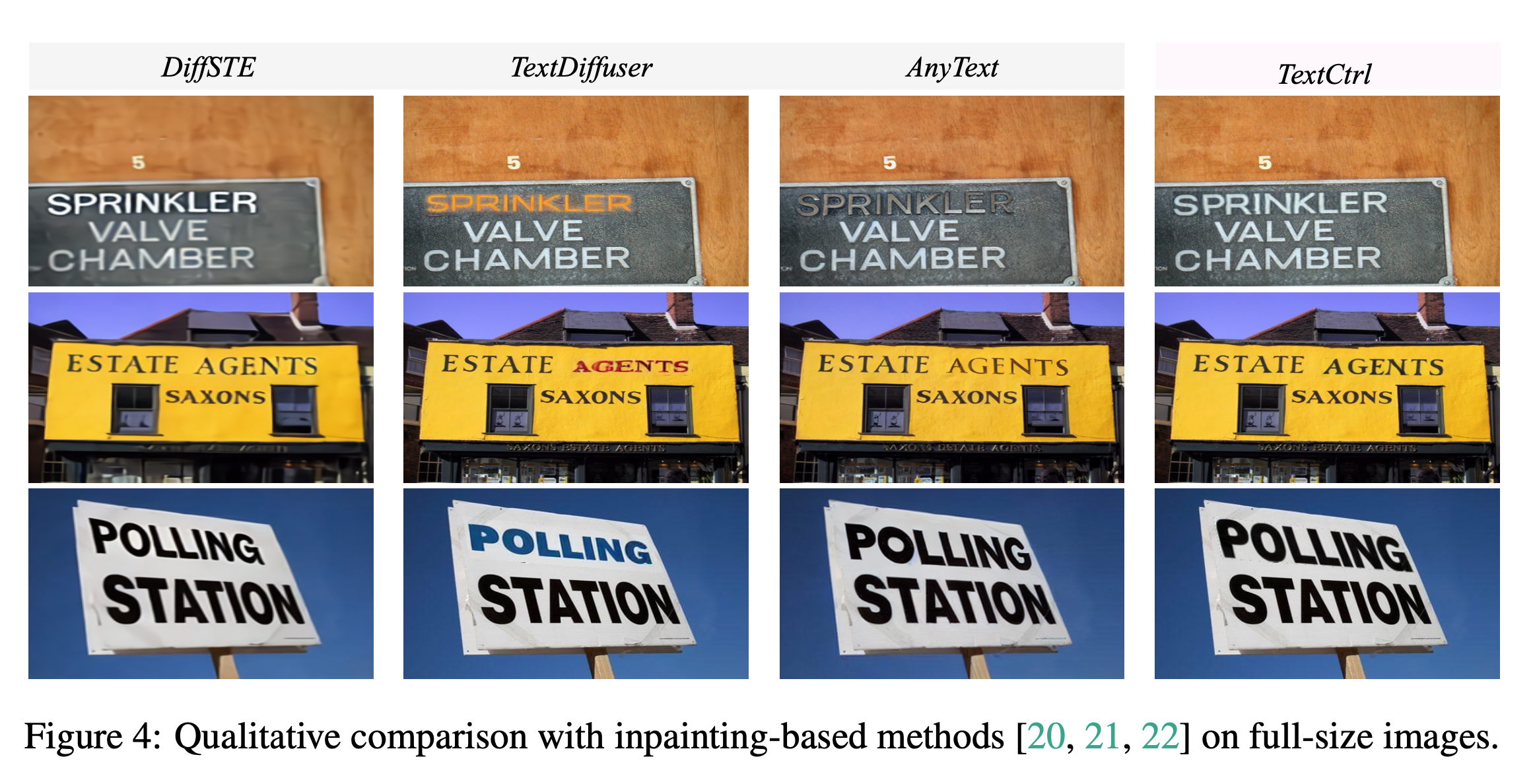 • GAN 기반 방법과 TextCtrl: synthesis manner로 텍스트 이미지를 생성한 뒤, 전체 크기 이미지에 삽입.
