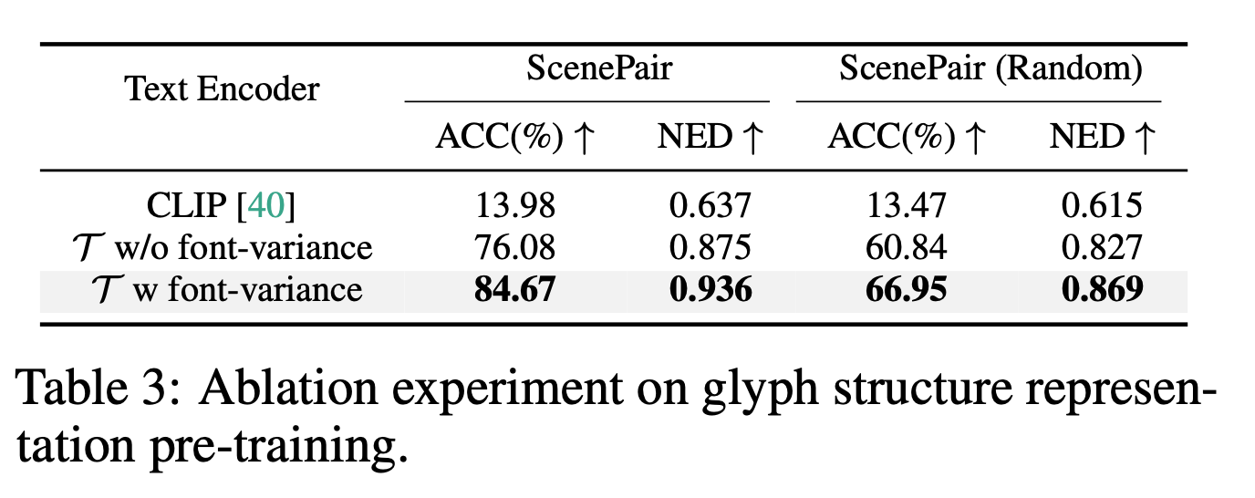 Conditional text prompt는 STE에서 편집된 텍스트 글리프 glyph guide 하는 데 중요한 역할을 합니다. 저자들은 여러가지 text encoder를 실험한 결과 일반적인 CLIP은 spelling mistakes을 자주 겪었으며, 저자들이 제안한 font-variance 방법이 가장 높은 성능을 보여주었다고 합니다.