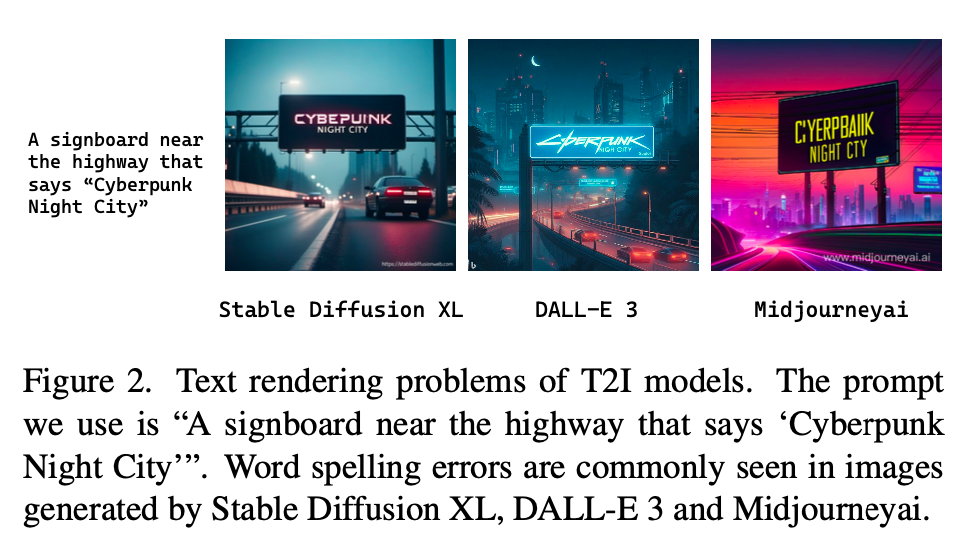 Diffusion 기반 T2I model의 성능이 매우 발전되고 있기는 하지만… Text rendering은 아직 challenging한 문제라고 합니다.