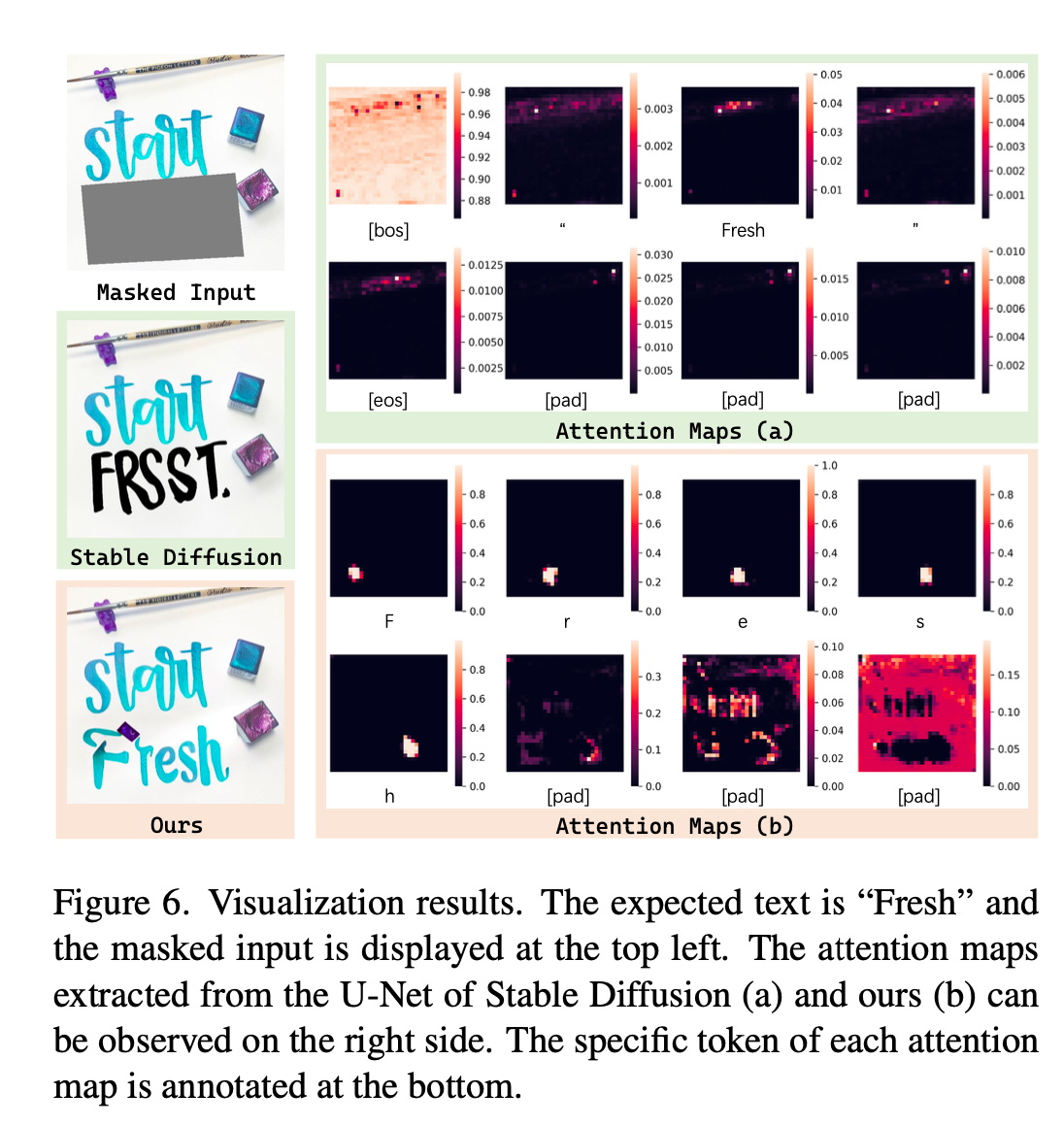 또한 일반적인 SD 모델을 사용한 CA map과 저자들의 CA map을 분석한 결과, character 위치에 attention이 잘 걸리는 것을 확인할 수 있습니다.